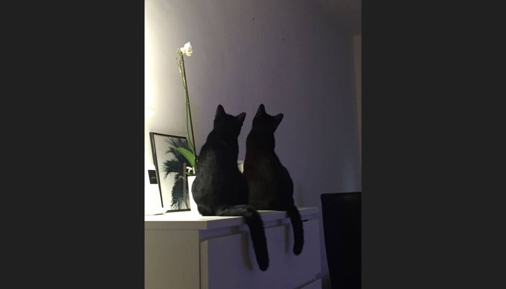 Sleek and glossy black, Mister and Lady were easy to tell apart because Lady was always the first on scene when I catered mealtimes. And that was a problem for her everlastingly shy brother. Both cats loved wet food and, if Mister didn’t put himself out there, his sister would lap it all up. But
